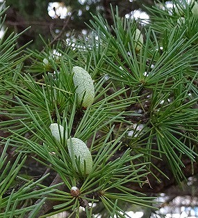 構内に数多くある松の木に、青い松ぼっくりがなり始めています。