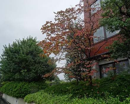 雨の花水木 2016.09.28 初秋の構内のハナミズキが、雨の中きれいに赤く色づいています。 日米の交流として、ハナミズキが日本に初めて送られてから約100年 今では、日本でも人気のある木々のひとつとなっています。 春には、白や薄紅色の花が咲き、秋には、上品な赤に染まります。 本社ビルのレンガ色に同調して、お互いに心地良さそうで、 雨の多い北陸には、こんな色合いが心を和ませてくれます。