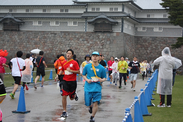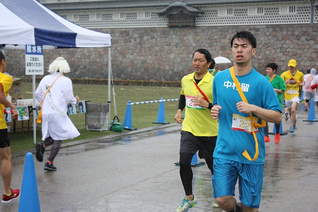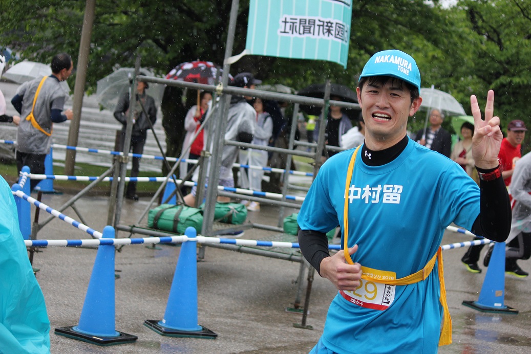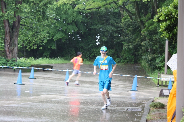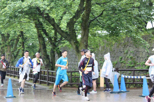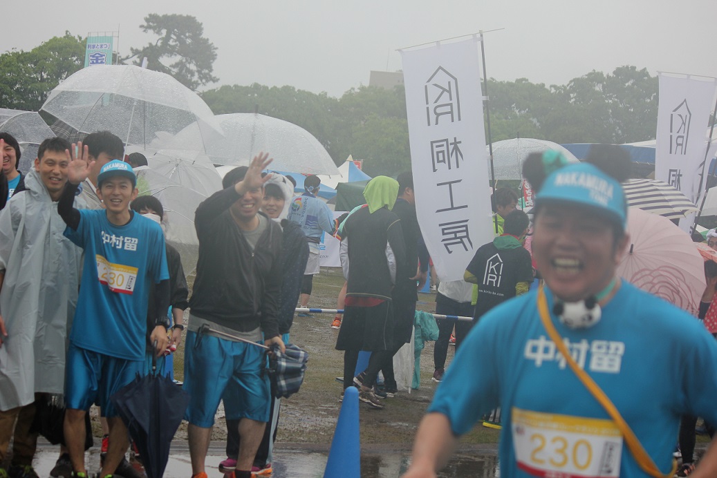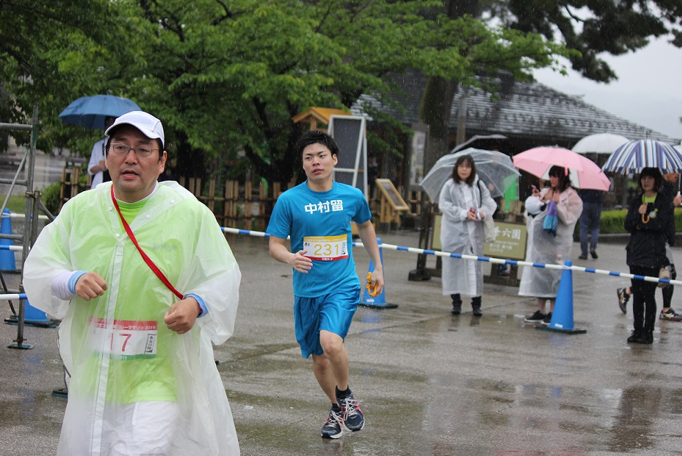 今年はあいにくの大雨で、参加者たちは土砂降りの中タスキをつなぎ、42.195kmを完走しました。