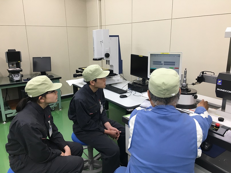 高校生インターンシップを実施しています。 2018.05.25 4月から高校生のインターンシップを実施しています。 このインターンシップは夏季インターンシップに先駆けて実施され、 学生に製造での基本的な技能の取得と会社としてものづくりの工程を理解してもらい、 最終的に課題を持ってそれを学生自身で解決するというプログラム内容になっています。 この日は部品の測定について、当社の測定室で社員からの実習を受けてもらいました。 高校生のお二人は実際に測定器を使いながら、精密な測定方法について真剣に学んでいました。