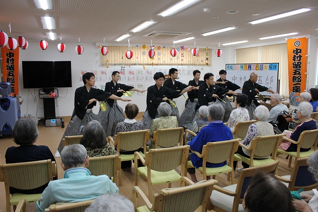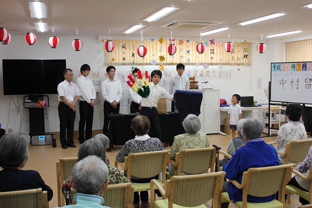 留五郎一座 ”あおぞら” にて公演!! 2018.07.31 7月28日(土)今回は、 金沢市四十万にある 住宅型有料老人ホーム「あおぞら」にて留五郎一座の公演がありました。 まずは座長による口上、そして中村踊り続いてマジック同好会によるマジックショーが行われました。 今回は新メンバーも参加し大いに会場を沸かせました。 最後に、白嶺太鼓同好会の迫力ある太鼓の演奏があり、大盛況のうちに終了いたしました。 今回、「あおぞら」様では、初めての公演でありましたが、楽しんで頂けたご様子で安心いたしました。