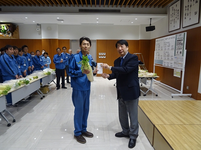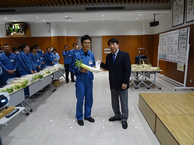 ひねりがきれいなダイコンを作った総務部は、おもしろダイコン賞に選ばれました。